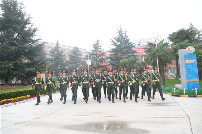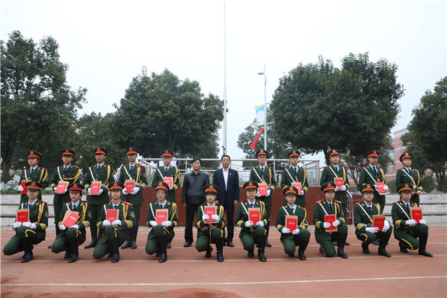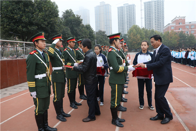 校长王常劳和校党委书记韩党卫为国旗护卫队队员颁奖