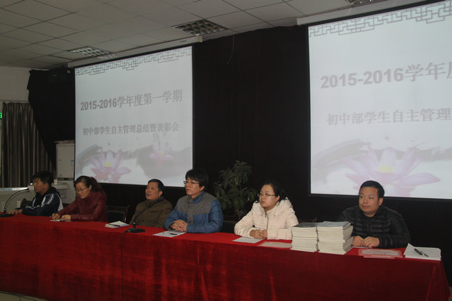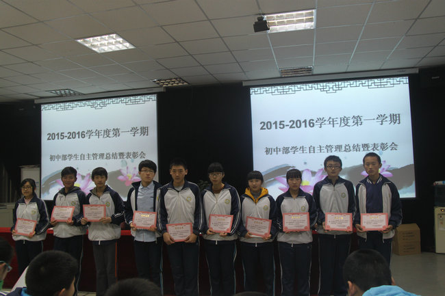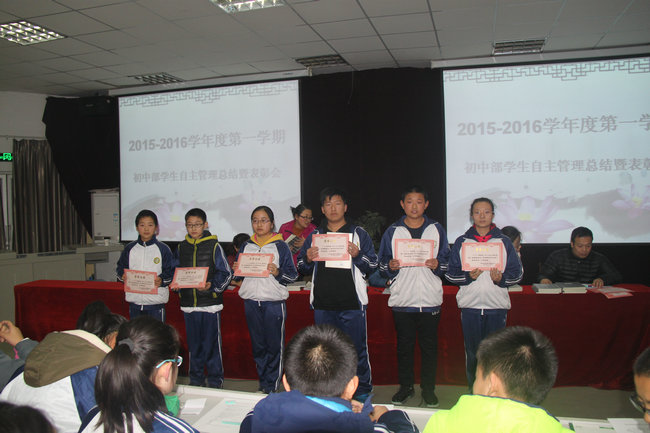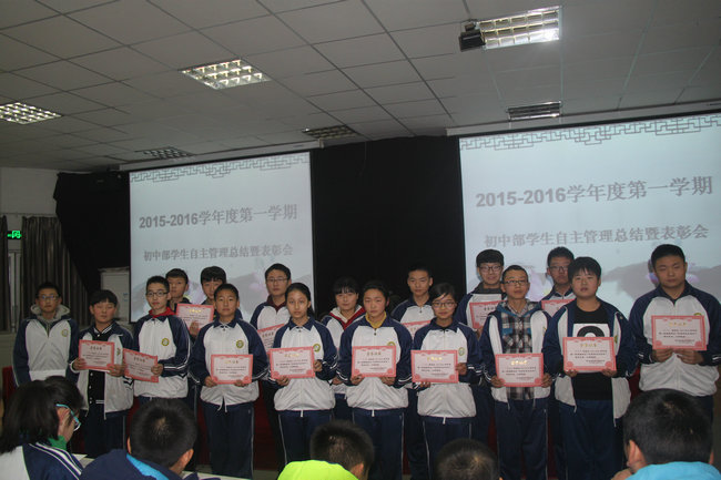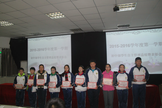 为更好地做好学生管理和教育工作,激发学生自主管理的主动性和积极性,2016年1月4日,我校初中部在多功能厅召开学生自主管理总结暨表彰大会。大会由初中部学生会主席任纪元主持,副校长张书民、政教处主任王忠俊、年级组长邓莎莎、李玉霞、方凯出席大会。