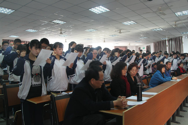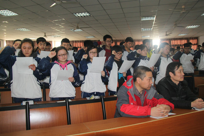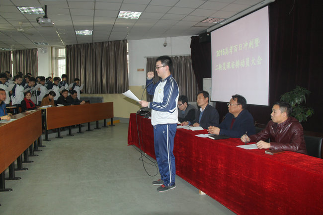 2月26日下午,我校高三年级在多功能厅隆重举行了2016届高三百日誓师暨二轮复课安排动员大会。大会由高三年级组长张满户主持,韩党卫副校长、王旭主任、陈军主任、徐恒明副主任出席,全体高三教师与学生参加大会。