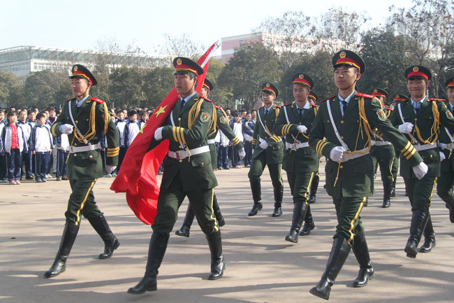开学典礼在庄重而严肃的升旗仪式中开始。国旗班的同学身姿矫健、步伐有力,全体师生精神饱满、神情庄重。
