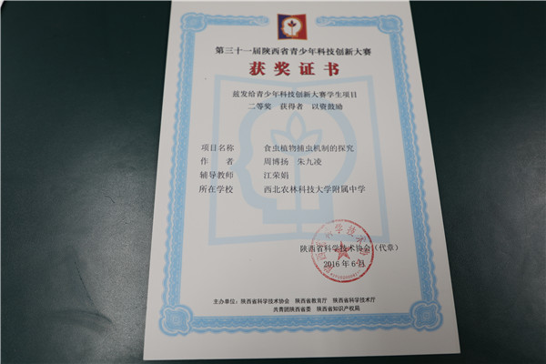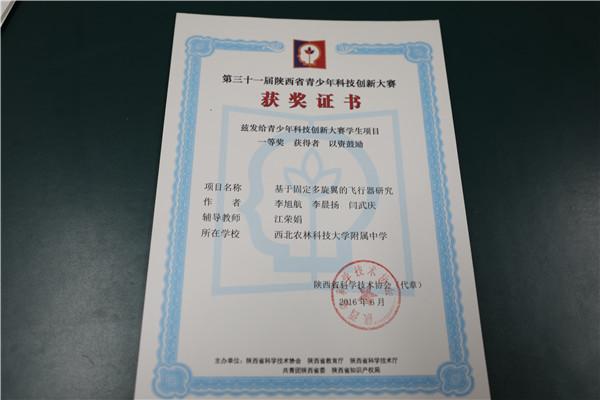 在第三十一届陕西省青少年科技创新大赛中,我校学生取得了优异成绩。李旭航、李晨扬、闫武庆三位同学的项目《基于固定多旋翼的飞行器研究》,获得一等奖,周博扬、朱九凌两位同学的项目《食虫植物捕虫机制的探究》获得二等奖,辅导教师均为江荣娟老师。