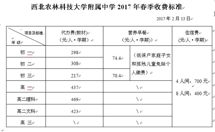 附1:西北农林科技大学附属中学2017年春季收费标准