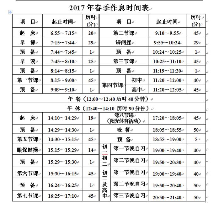 注:本作息时间表从2017年2月13日开始执行。