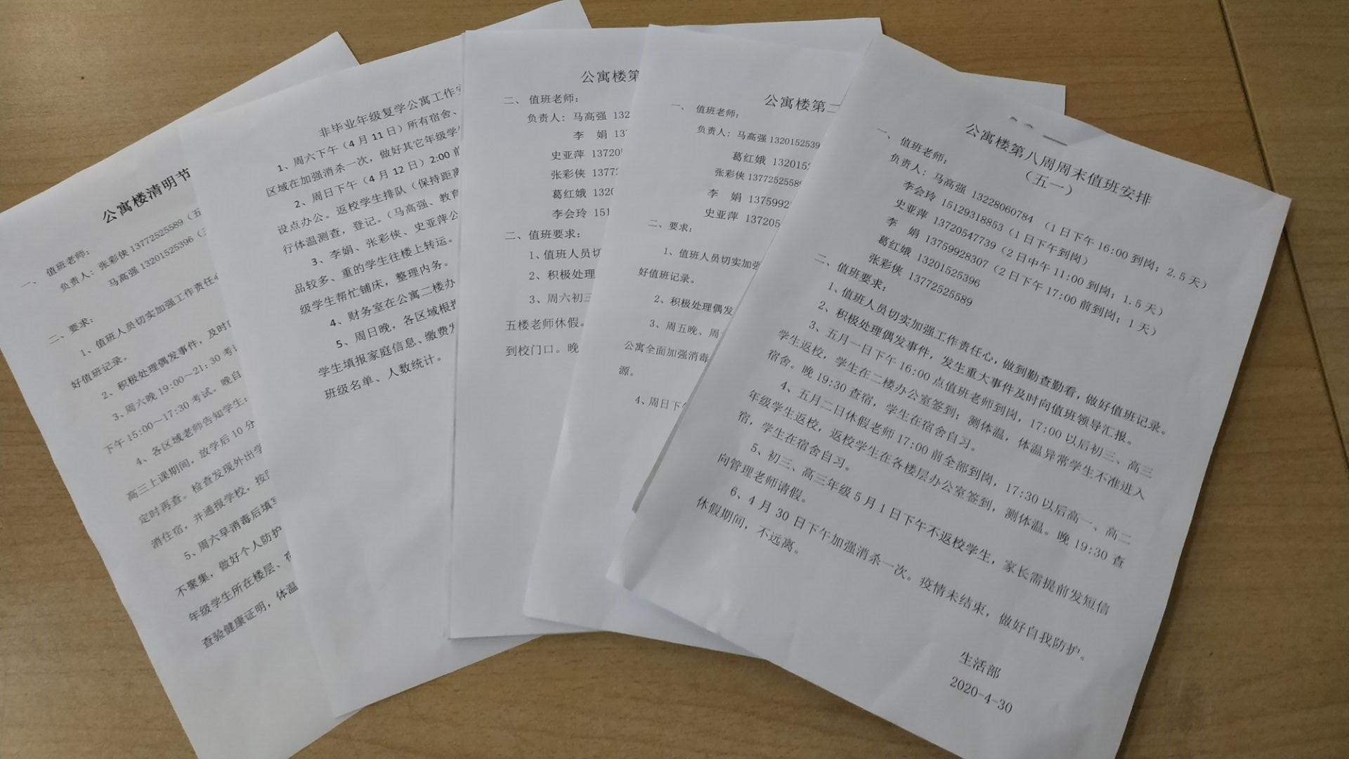 教育处、总务处联合制定了《住校生入住方案、流程、宿舍分配》、《疫情防控期间公寓楼管理办法》、《公寓楼疫情防控管理老师分工》、《公寓楼日常消毒、通风记录》、《住宿生情况摸排谈话反馈信息记录》,并对宿管老师提出明确要求,要严格按照学校防控工作手册认真执行,将一日常规工作落到实处。