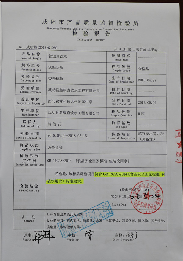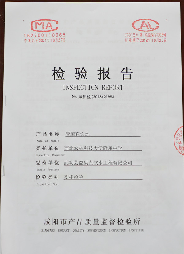 我校直饮水系统采用国家品牌产品,在企业通过专业机构检验合格的基础上,我校又多点采样送第三方专业机构进行水质检测。经检验,直饮水水质符合GB19298-2014《食品安全国家标准 包装饮用水》标准要求。