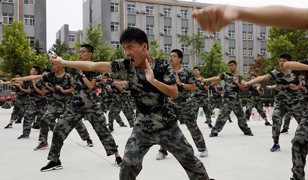 今天是军训的第四天,秋高气爽,适宜练兵,今天的训练内容是表演方队的训练,初一新生被分为两个方队,女生是国学操方队,男生是搏击操方队。在方队训练中,女生的国学操训练,动作柔美,整齐划一,男生的搏击操方队,也不甘落后,气势如虹,每个动作都刚劲有力,尽展男子汉保家卫国之气概!在今天的训练中,孩子们的脸上多了些笑容,少了些紧张,多了份坚强,少了份娇气。在这四天的军训生活中,孩子们的稚气在逐渐褪去。在逐渐学会战胜自我,学着成长。