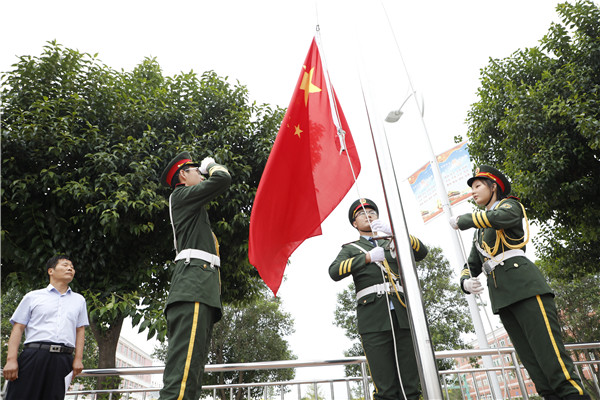 仪式开始后,英姿飒爽的国旗班旗手迈着矫健的步伐,护卫着国旗走到旗杆前。伴随着旋律激昂的国歌,国旗冉冉升起。