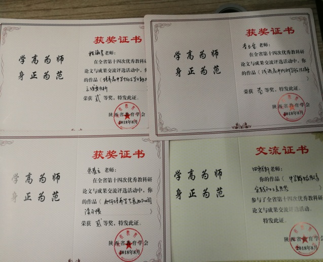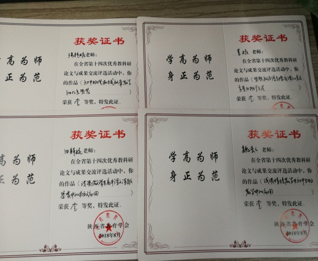 2018年11月,附中8名教师在陕西省第14届优秀教科研论文与成果交流评选活动中获奖,其中张艳妮、董妮、田鲜妮、魏凌云四位教师获一等奖,程淑芳、李玉宝、朱秦立三位教师获二等奖,田雅轩老师获优秀奖。