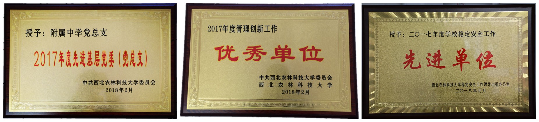 一、年初,大学授予附中“管理创新”、“稳定安全”、“先进党委(总支)”等全方位荣誉。充分肯定,激励未来。
