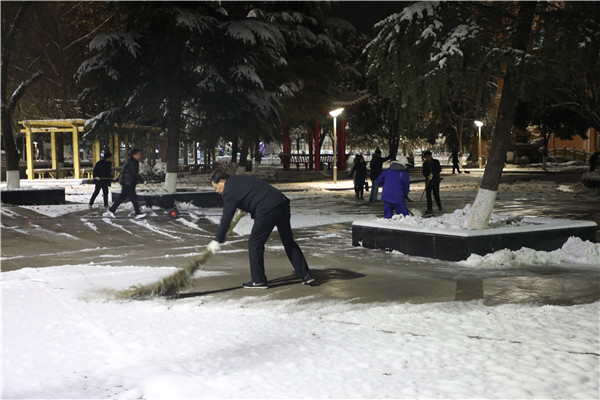 12月27日,杨凌地区迎来了今冬的第一场大雪。皑皑白雪让校园银装素裹,也造成了路面的湿滑。为保障师生顺利出行,学校启动应急预案,组织教职工进行除雪行动。