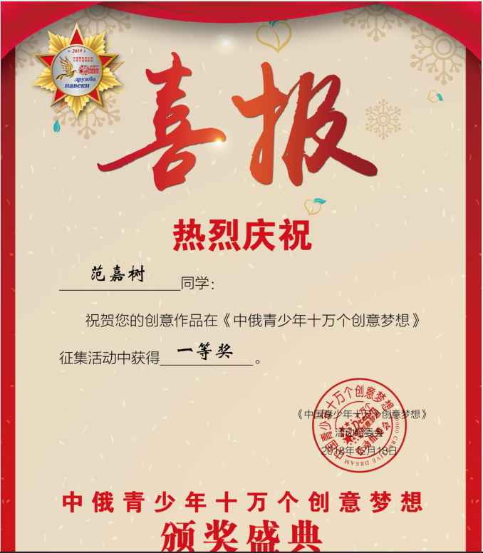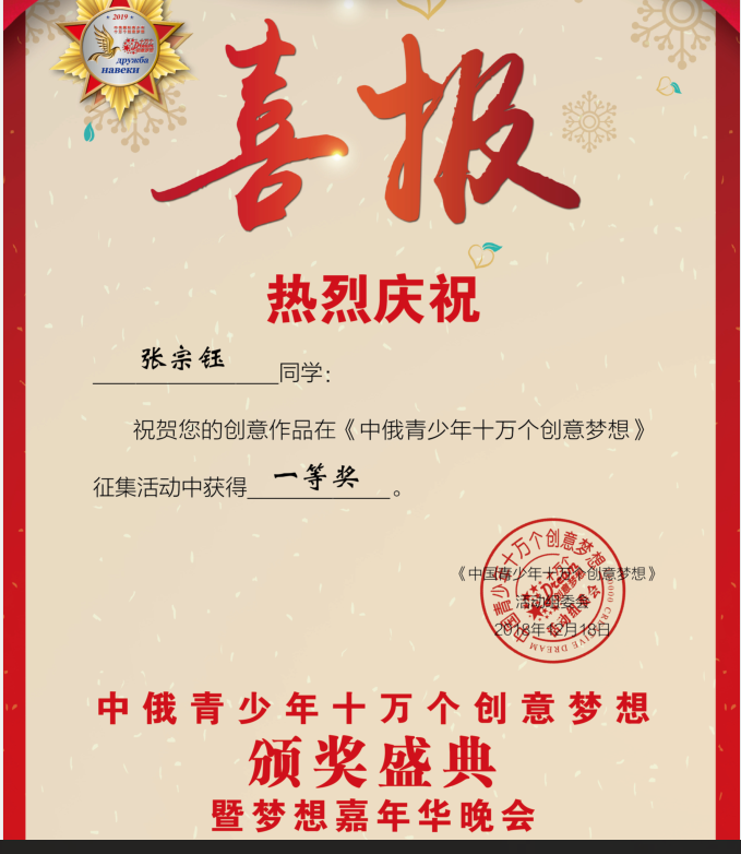 据悉,一等奖获得者获得“中俄青少年创意梦想大使”勋章和证书,将受邀赴俄罗斯参加“中俄青少年十万个创意梦想大会”颁奖盛典。指导教师获得“全国最佳创新教师”证书,将受邀赴俄罗斯参加颁奖盛典和“2019中俄创新教师教研交流”活动。