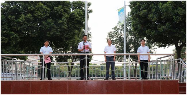 9月2日,我校3000余名师生在田径场隆重举行了新学年首次升旗仪式。韩党卫书记主持仪式,王常劳校长作新学年致辞,刘杰副校长介绍初一高一招生情况,新教师代表高嘉蔚发言。