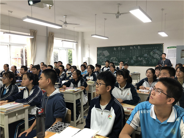 下午第三节课,高一1班的同学们怀着激动的心情,期待着这位外国友人的到来。邹宇锋副处长为同学们介绍了Jones教授的研究领域以及此次到访的目的。Jones教授用生动的图片和视频,介绍了自己的家庭、生长环境、美国著名的自然景观,以及在太空飞船上研究水与土壤之间的反应的实验,以及在没有地球引力的情况下,如何做运动以及饮食。