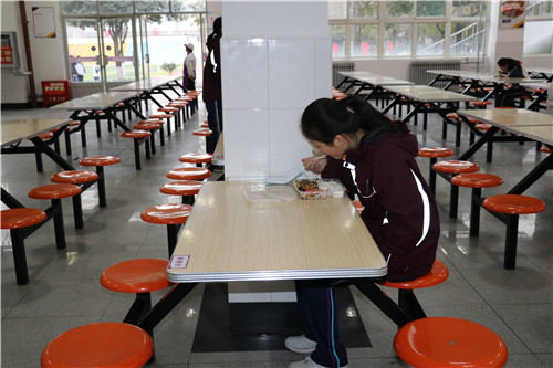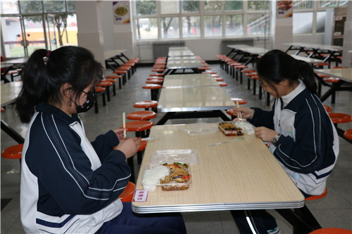 放学后,按照错时就餐的原则,女同学首先来到餐厅,从餐厅门口设置的测温门有序进入,并对双手进行消毒。餐厅全部使用一次性餐具,并将饭菜搭配成整份,缩短了同学们的取餐时间。打饭时,同学们按照地上标识,间隔一米排队等候。就餐时,每位同学对角落座,避免聚集。