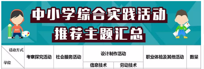大概每个学段的学校和老师都想知道,究竟哪些综合实践活动适合带着学生们去做呢?别急,《指导纲要》的附录部分中就分类型、分学段推荐了152个活动主题。老师们,快来收好这份“宝典”吧!