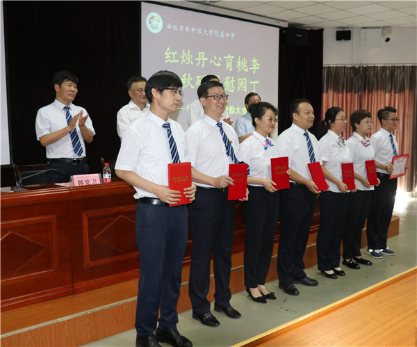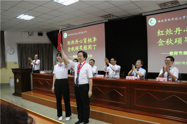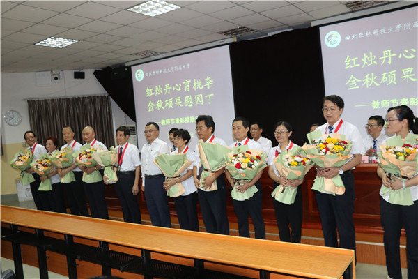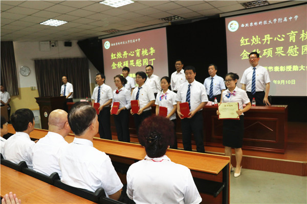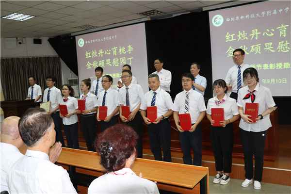 9月10日,我校召开以“红烛丹心育桃李 金秋硕果慰园丁”为主题的教师节表彰暨授勋大会,西北农林科技大学党委副书记吕卫东出席。大会表彰了在示范区教育局获奖的先进个人、校级先进个人,吕卫东副书记为有30年教龄的老教师授勋。