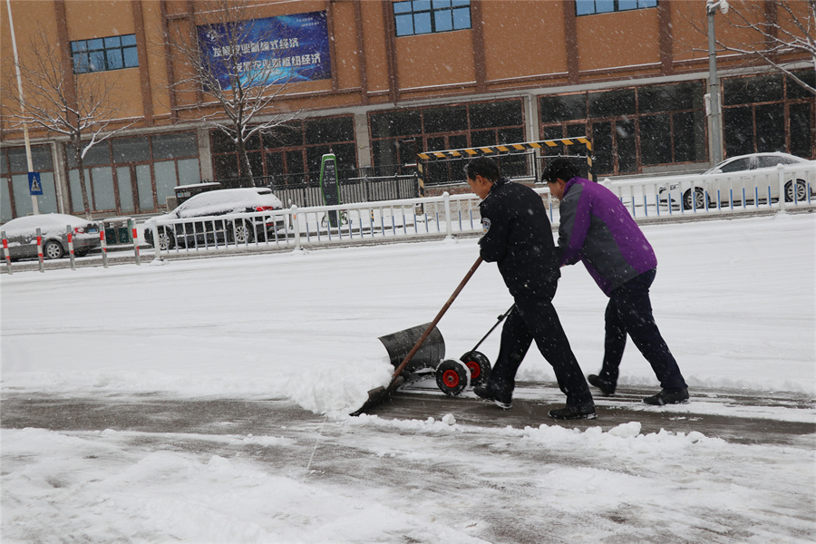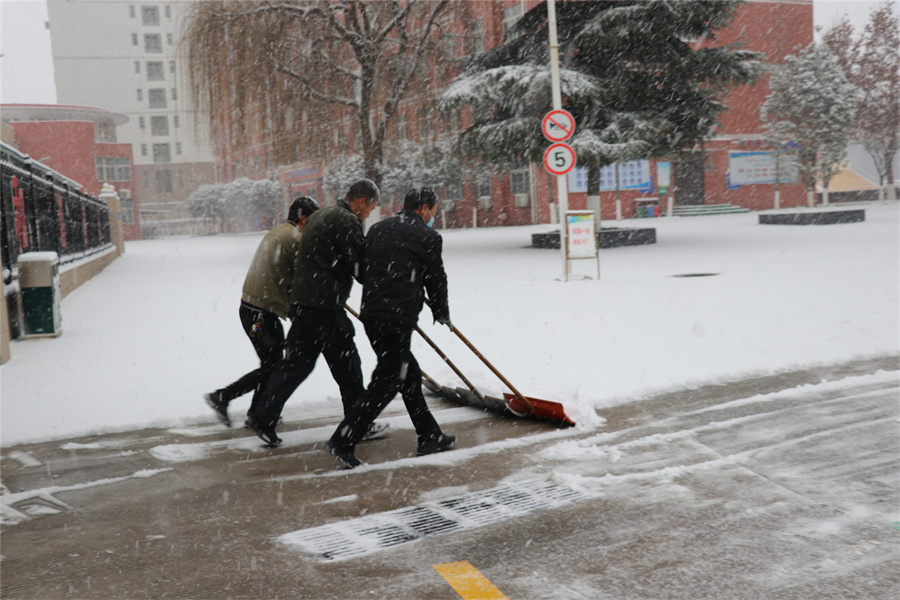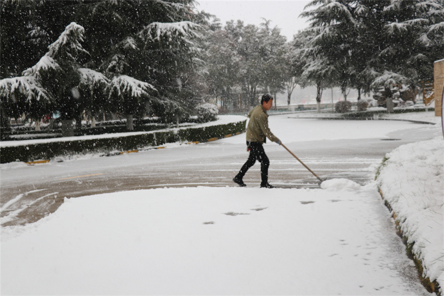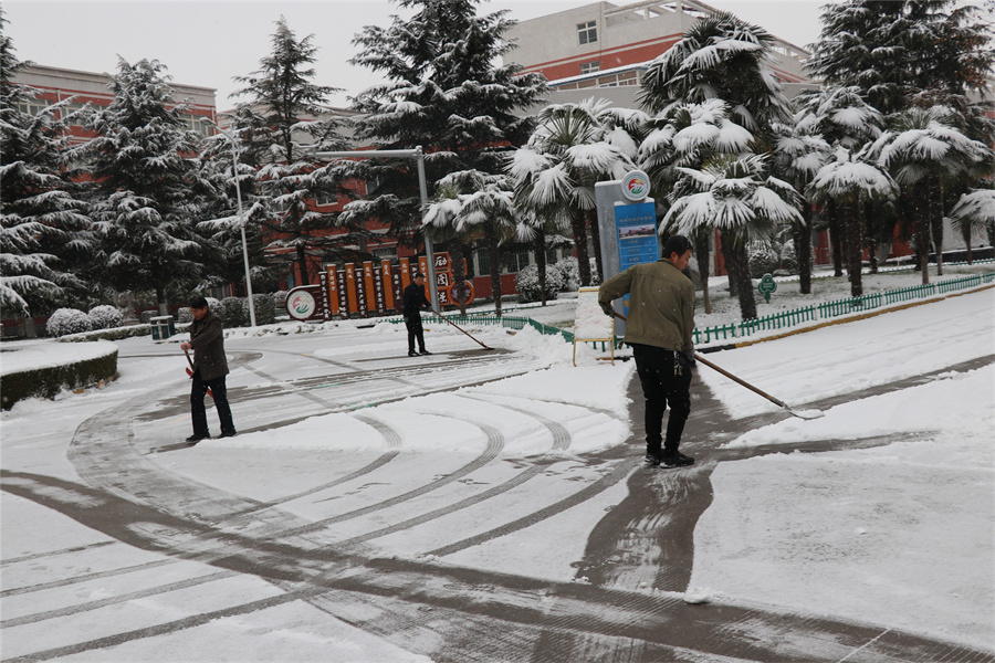 “忽如一夜春风来,千树万树梨花开”,一场降雪翩然而至,校园被大雪装点成银装素裹的世界。大雪带来了难得的美景,却也给学校师生的出行带来不便。12月26日上午,我校领导组织总务处工作人员对校园主干道积雪进行了清扫。