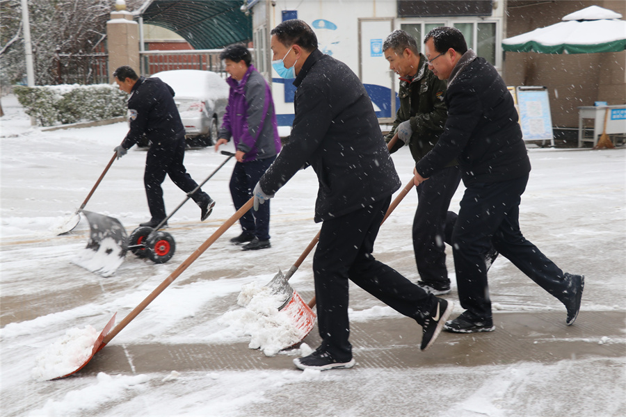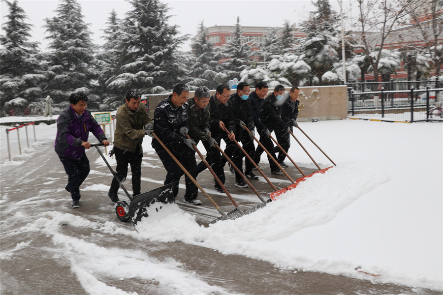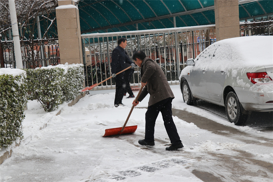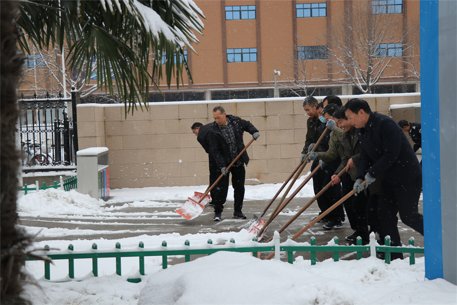在王常劳校长带领下,大家拿起除雪工具,积极投身扫雪除冰行动中。大雪纷飞,已将地面铺上了厚厚一层,但这丝毫没有影响大家的工作热情。他们利用铁锨等工具,相互配合、交替推进,一鼓作气地将校门口、交通主干道等的积雪全部清扫干净。下午,学校继续安排更多人员,清扫剩余区域。