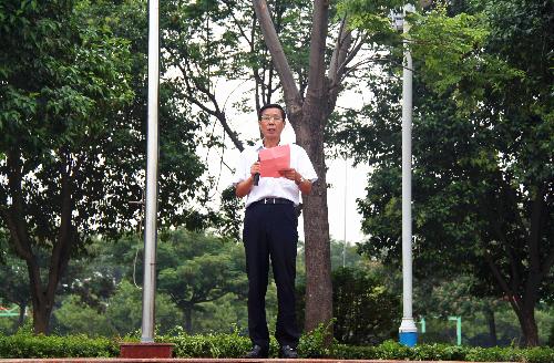 升旗仪式后,王常劳校长向全校师生致辞。他对新同学的到来表示欢迎。在回顾了我校过去一学年的成绩后,他强调,在新的学年,我校高点定位,改革创新,确定了更高的发展目标。为实现目标,全体教职员工必须爱岗敬业,强化岗位责任意识和质量意识;全体同学要树立目标,遵守纪律,争做有文化、讲文明、守纪律的优秀学生。他还向毕业班提出了希望,希望他们树立信心,科学备考,顽强拼搏,交一份优秀的答卷。