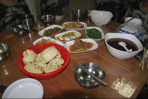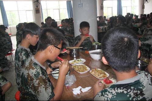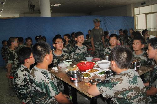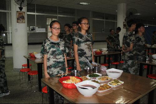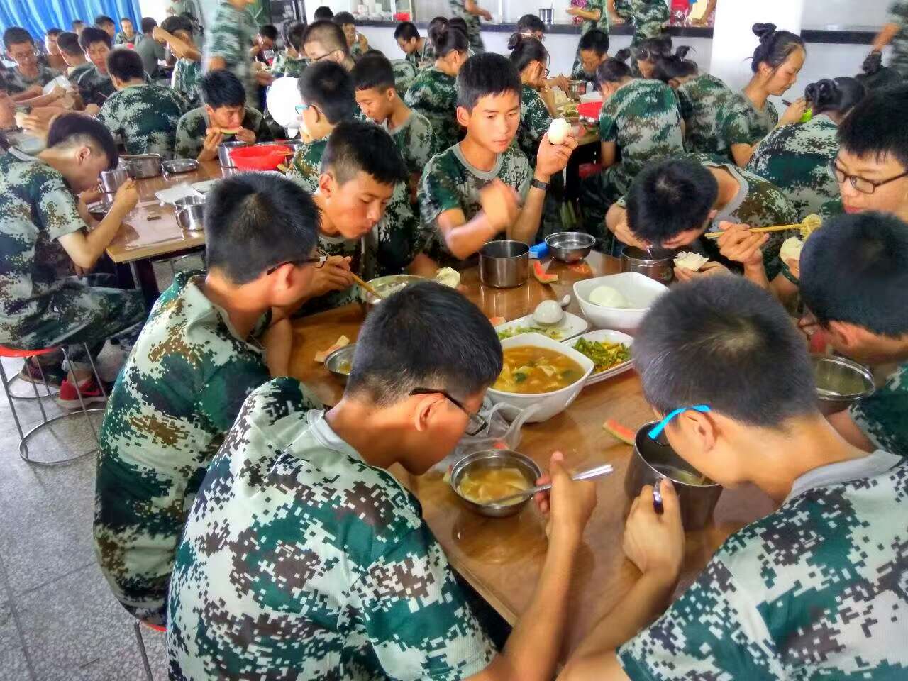 一日三餐是训练场之外的另一件大事。在训练结束后,所有同学在教官的组织下拿上自己的碗筷,于餐厅下集合队伍。每桌的值日同学提前到餐厅为同一桌的战友打好饭菜后,所有同学有秩序地进入餐厅就坐。在吃饭之前,大家要齐声背诵“谁知盘中餐,粒粒皆辛苦”的诗句,吃饭过程中不允许任何人说话,吃完饭值日同学需要收拾餐桌卫生,其他同学清洗自己的碗筷。整个就餐过程秩序井然,充分践行了就餐礼仪,这是对同学们无声的教育。