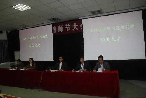 王常劳校长强调,为了实现学校的跨越式发展,实现名校战略,也为了解决大学职工的后顾之忧,配合大学的人才战略,我校创建示范化高中已势在必行。通过创建活动,将使我校成为一所理念先进、设施先进、队伍强大、质量一流、特色鲜明的社会公认的名校。他希望,全体教职工众志成城、团结一心,提升自身水平,做好各项工作,以顺利迎接评估检查,实现我们的目标。