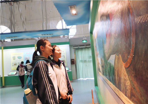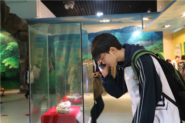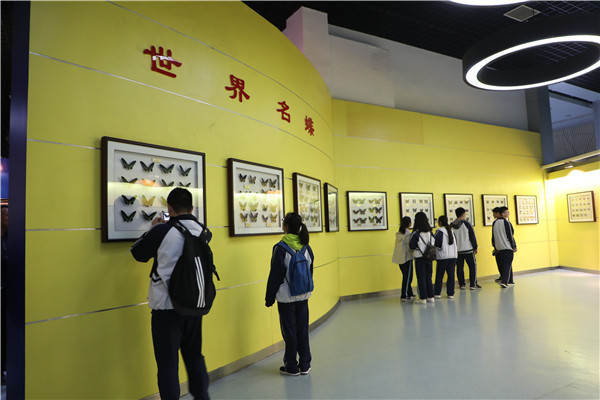 博览园中,春意盎然。远离了公式和课本,同学们呼吸着清新的空气,头脑中紧绷的神经得到了暂时的放松。鲜花绿草作伴,欢声笑语;碧水游鱼作陪,高歌猛进。在湖边集体合影后,同学们走进昆虫馆、动物馆、农业馆等场馆,观察思考,进行着自己的探索之旅。初三4班的符家瑞同学打开手机灯光,仔细地观察着橱窗中陈列的标本:“我对动物馆最感兴趣,想了解清楚它们身体的结构。”从农业馆走出来的几个女同学与李憬波老师交流起农业用具的历史,李老师饶有兴致地为她们讲解了石磨、犁、锄头、架子车等的用途。