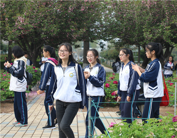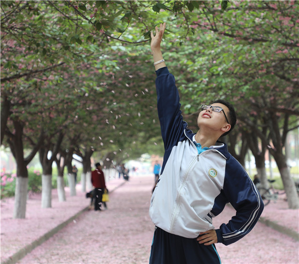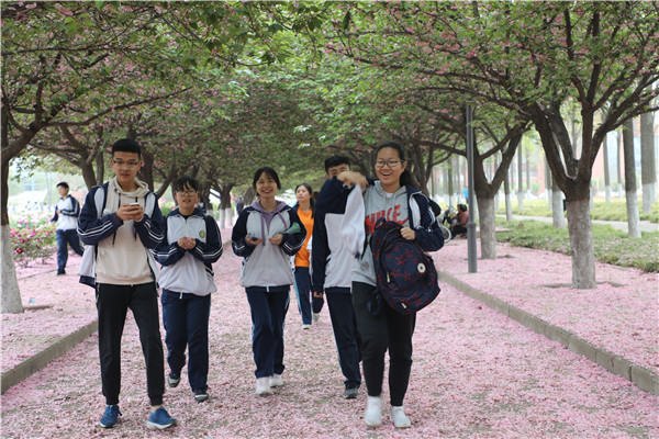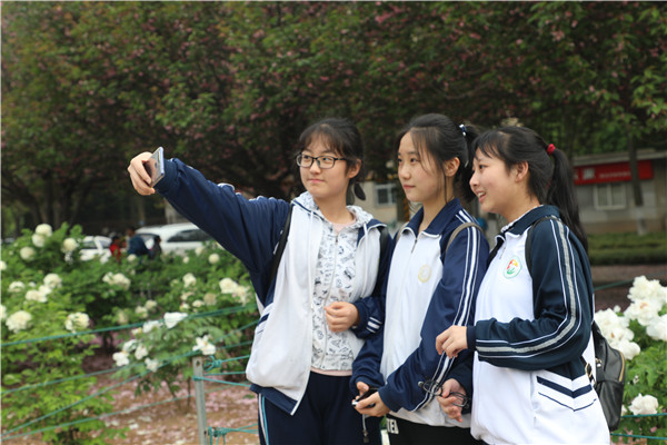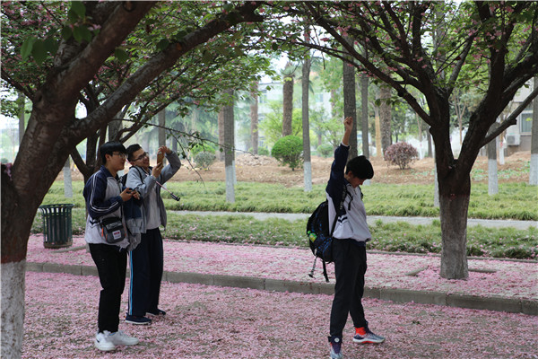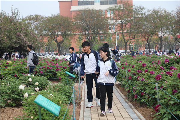 从博览园西门出来,师生们进入了大学校园,在牡丹园驻足赏花。“唯有牡丹真国色,花开时节动京城。”各个品种的牡丹花争奇斗艳、堆锦积秀,红的艳丽、白的纯洁、粉的温馨、紫的高贵。旁边的樱花大道落英缤纷,像下了一场粉色的雪,更增添了梦幻之美。同学们或自拍、或拍花、或与同学合影,用手机定格了青春美丽的瞬间。高三4班的张文静同学笑着说:“今天真的很开心,我会更加努力,考一个好大学。