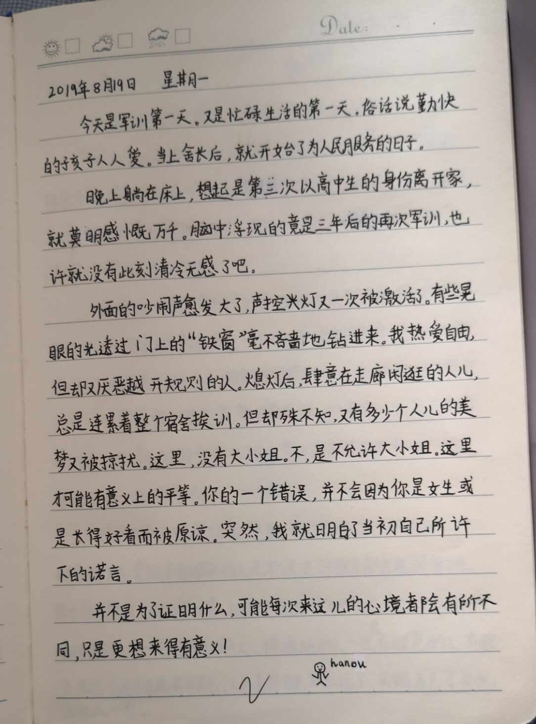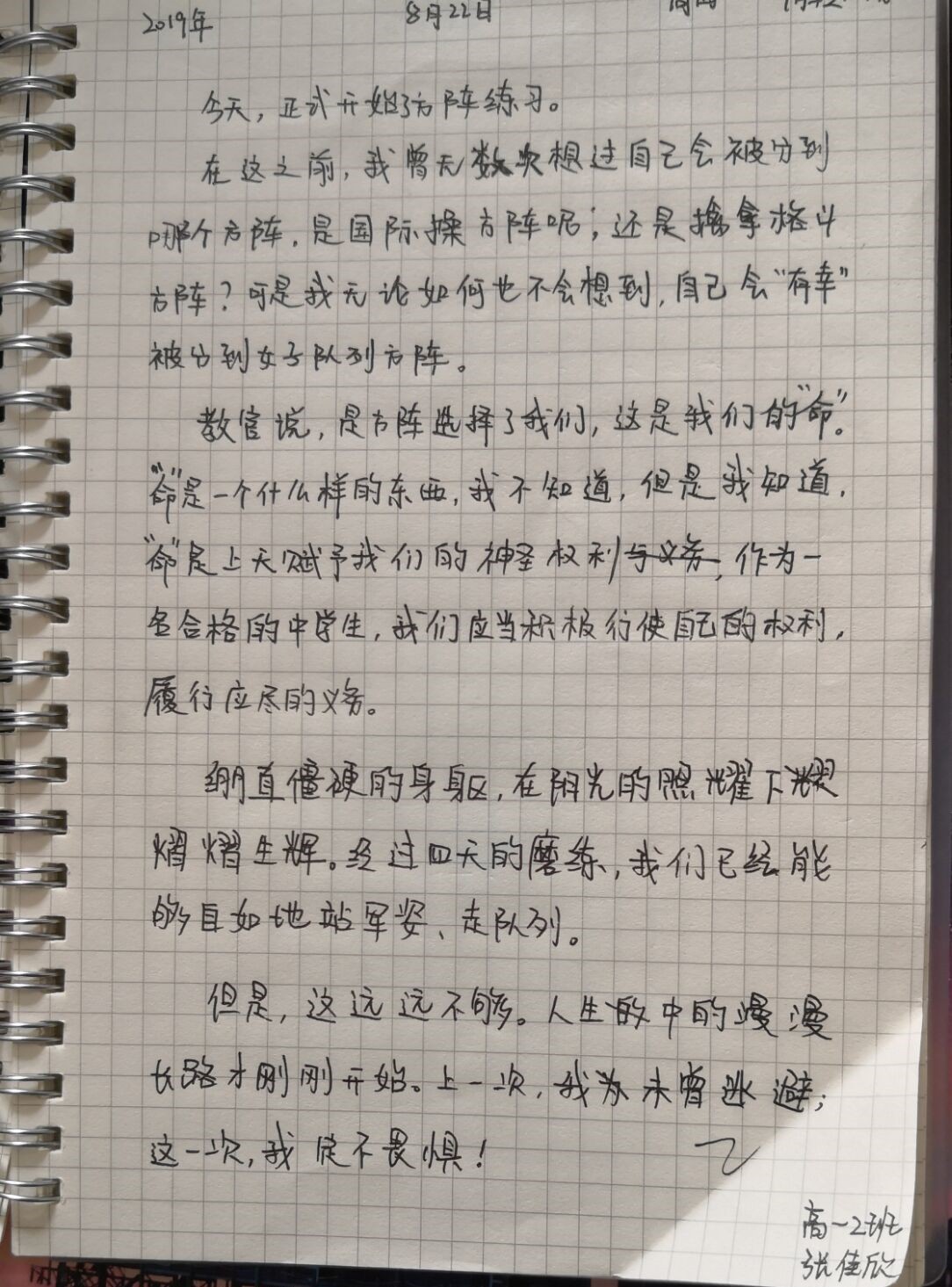 对于自己被分配到女子队列方阵,高一2班的张佳欣同学一开始并不满意。几天的训练下来,张佳欣同学逐渐认识到,每个方队都有自己的价值和使命。她在日记中写道:“作为一名合格的中学生,我们应当积极行使自己的权利,履行应尽的义务……经过四天的训练,我们已经能自如地站军姿、走队列。但是,这远远不够,人生中的漫漫长路才刚刚开始。上一次,我未曾逃避,这一次我定不畏惧!”和她一样,同学们在这里,体会到成长的滋味。