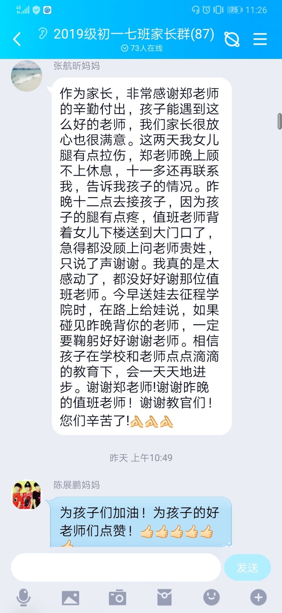 初一年级宋鑫老师,凌晨一点多,得知一位同学肌肉拉伤,二话不说,将这位同学从四楼背到军训基地门口。事后,家长感动地说:“感谢老师的辛勤付出,孩子能遇到这么好的老师,我们家长很放心也很满意。”
