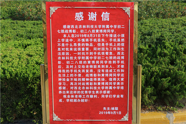 8月31日中午,我校初二年级学生战博彰、黄博文在回家路上,捡到了一部苹果手机。怕失主着急,两位同学返回学校,将手机交给了老师。老师通过手机联系到失主。失主接到电话后,立即赶来,取回了手机,激动地对我校老师说:“手机里的信息对我很重要,谢谢你们!谢谢西农大附中,培养出这么优秀的学生!”拾金不昧的战博彰、黄博文两位同学腼腆地说:“他丢了手机,肯定很着急,所以我们赶紧交给老师。现在物归原主,我们也很高兴。”