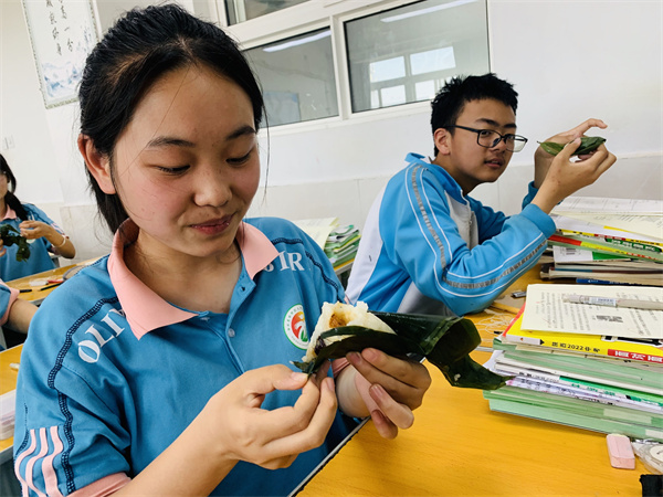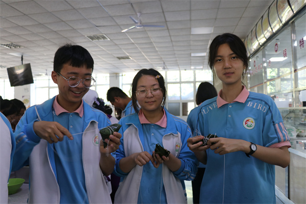 在餐厅厨师的指导下,同学们认真地学习包粽子:卷粽叶、填米、压实、盖紧、扎绳……一道道工序有条不紊地进行着,一双双忙碌的手穿梭在粽叶间。翠绿的粽叶、雪白的糯米、鲜红的枣子在他们手中瞬间便包成了一个个菱角分明的小粽子。虽然有的粽子形状特别,有的“龇牙咧嘴”,但同学们却成就感十足,活动现场到处充满了欢声笑语。通过包粽子,同学们感受了我国传统文化的魅力,也加深了对传统文化的理解和热爱。