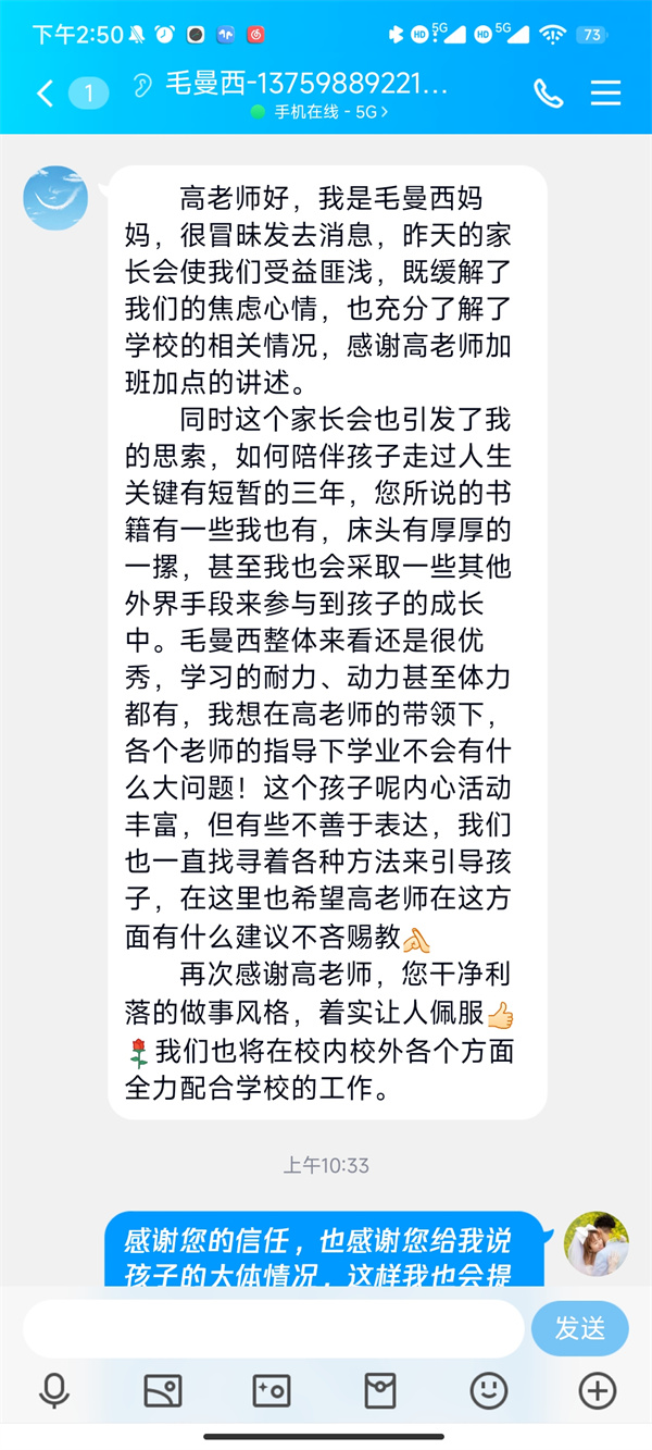 家长们积极配合,到会率高,仔细聆听,认真记录,反响热烈!通过本次线上家长会,家长们对学校开展的各项教育教学工作有了充分了解,同时也收获了家校合作的思路和方法。此次家长会架起了家校沟通的桥梁,拉近了家校之间的距离,进一步促进了家校互动的良好态势,为我校今后教育教学工作的顺利开展奠定了坚实基础。