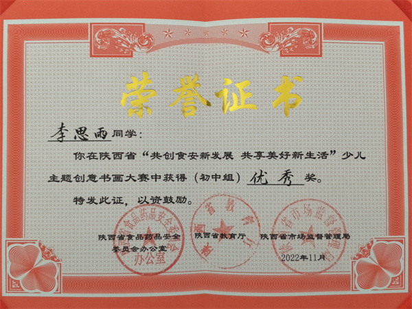 我校学生在陕西省“共创食安新发展、共享美好新生活”少儿主题创意书画大赛中喜获佳绩
