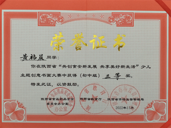 日前,由省食品药品安全委员会办公室和省教育厅、省市场监督管理局联合主办的“共创食安新发展、共享美好新生活”少儿主题创意书画大赛活动成绩揭晓,我校初一(9)班黄祎晨同学荣获省级三等奖,初二(8)班李思雨同学荣获省级优秀奖。