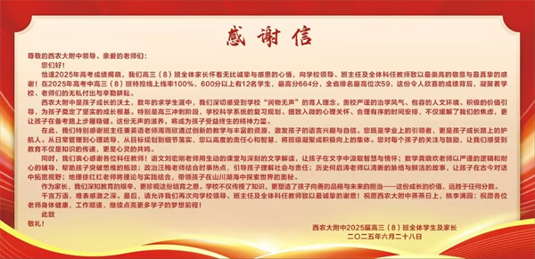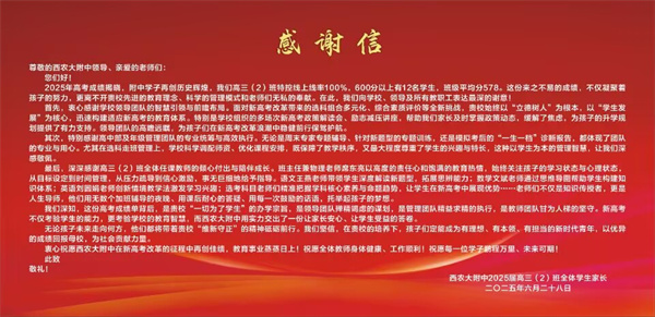 春风化雨润桃李,家校携手育栋梁。高考成绩揭晓后,我校高三毕业班家长满怀感激之情,陆续为学校赠送锦旗和感谢信,以此表达对学校及全体高三教师的诚挚谢意与崇高敬意。