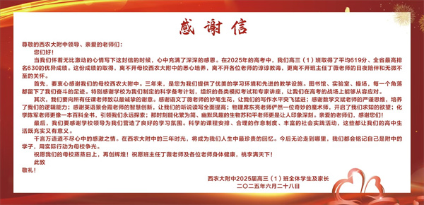 我校党委书记韩党卫、校长刘杰对家长们的信任与支持表示衷心感谢:“锦旗不仅是荣誉,更是责任和鞭策。每一位学子的成长都凝聚着家校双方的心血,看到孩子们学有所成,我们深感欣慰。未来,学校将继续秉持教育初心,不断提升教学质量,以更优质的教育服务,助力更多孩子实现梦想。”