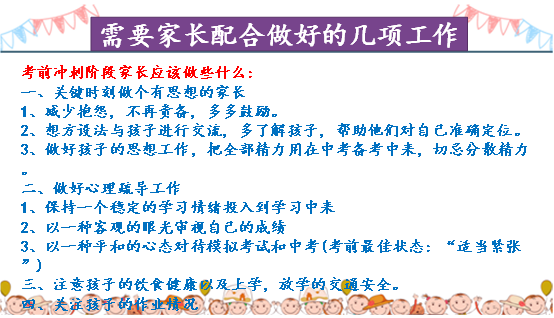 中考临近,为加强家校联系,发挥家校协作教育的合力,做好备战中考的最后冲刺,4月29日晚,我校初三年级召开家长会。
